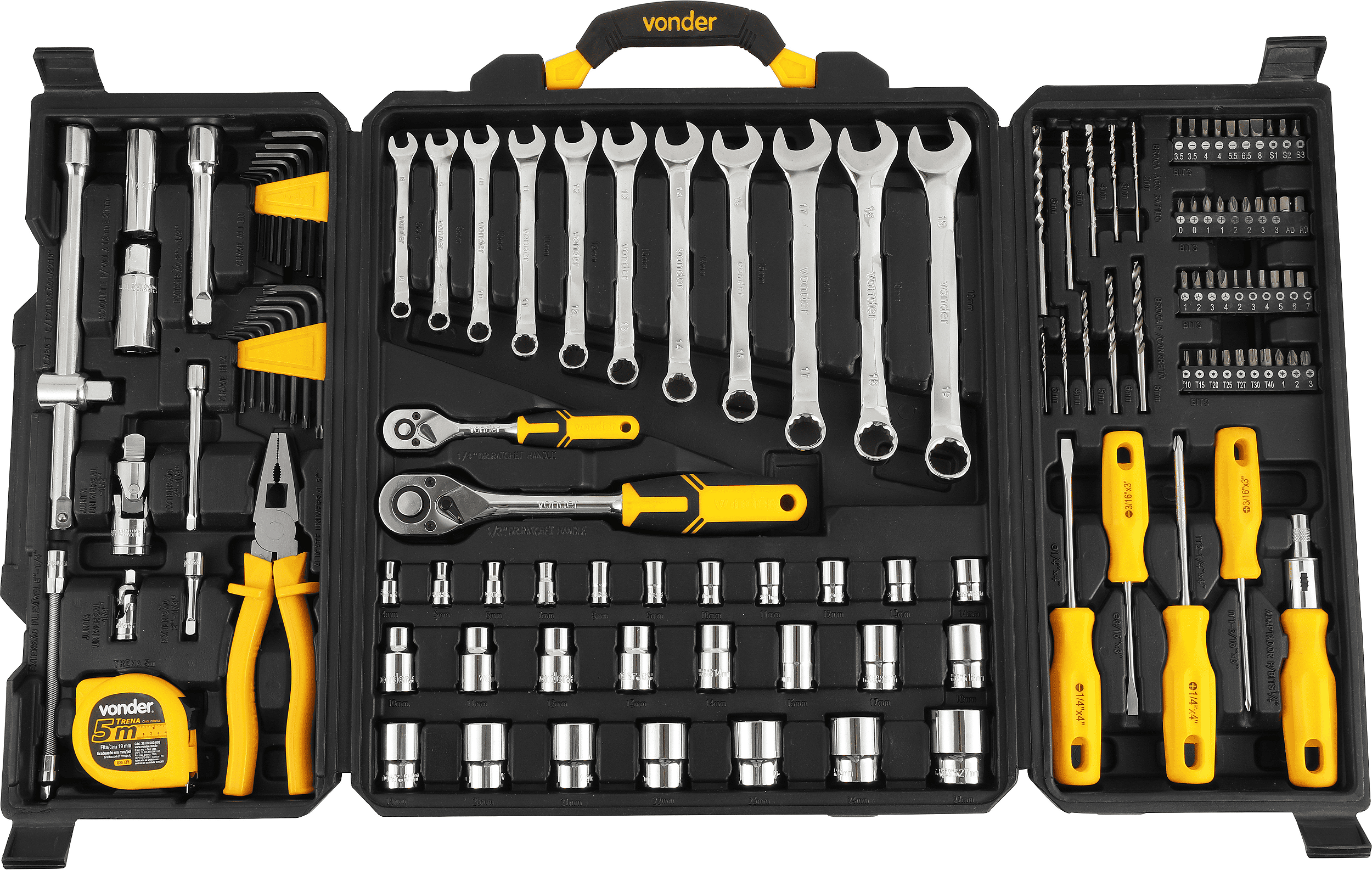 1 Jogo de ferramentas, composto por 128 peças, sendo: 1 maleta plástica, 1 porta-chaves allen/hexagonais, 1 porta-chaves hexalobulares, 4 porta-bits, 1 alicate universal 8" isolação 1000V em aço cromo vanádio, 8 chaves hexalobulares em aço cromo vanádio (T9, T10, T15, T20, T25, T27, T30, T40), 1 trena 5 m, 2 chaves de fenda em aço cromo vanádio (5,0 mm x 75 mm (3/16" x 3") e 6,3 mm x 100 mm (1/4" x 4")), 2 chaves phillips em aço cromo vanádio (5,0 mm x 75 mm (n°1 - 3/16" x 3") e 6,3 mm x 100 mm (n°2 - 1/4" x 4")), 8 chaves allen/hexagonais em aço cromo vanádio (1,5 mm, 2 mm, 2,5 mm, 3 mm, 4 mm, 5 mm, 5,5 mm e 6 mm), 11 chaves combinadas em aço cromo vanádio com acabamento cromado (8 mm, 9 mm, 10 mm, 11 mm, 12 mm, 13 mm, 14 mm, 15 mm, 17 mm, 18 mm e 19 mm), 15 soquetes sextavados encaixe 1/2" em aço cromo vanádio (10 mm, 11 mm, 12 mm, 13 mm, 14 mm, 15 mm, 17 mm, 18 mm, 19 mm, 20 mm, 21 mm, 22 mm, 23 mm, 24 mm e 27 mm), 1 catraca encaixe 1/2" em aço ao cromo, 1 extensão 5" em aço cromo vanádio encaixe 1/2", 1 junta universal em aço cromo vanádio encaixe 1/2", 1 cabo T em aço cromo vanádio encaixe 1/2" x 10”, 2 soquetes para vela de ignição em aço cromo vanádio (16 mm e 21 mm), 11 soquetes sextavados em aço cromo vanádio encaixe 1/4" (4 mm, 5 mm, 6 mm, 7 mm, 8 mm, 9 mm, 10 mm, 11 mm, 12 mm, 13 mm e 14 mm), 1 catraca encaixe 1/4" em aço ao Cromo, 1 extensão em aço cromo vanádio 2" encaixe 1/4", 1 extensão em aço cromo vanádio 4" encaixe 1/4", 1 extensão flexível 6" em aço cromo vanádio encaixe 1/4", 1 junta universal em aço cromo vanádio encaixe 1/4", 1 cabo adaptador para bits com catraca encaixe 1/4", bits magnéticos em aço cromo vanádio encaixe 1/4": 7 fenda (3,5 mm (2 peças), 4 mm (2 peças), 5,5 mm, 6,5 mm e 8 mm), 8 phillips (N° 0, N° 1, N° 2 e N° 3 (2 peças cada)), 6 allen (2 mm, 3 mm, 4 mm, 5 mm, 6 mm e 7 mm), 3 quadrados (S1, S2 e S3), 7 hexalobular (T10, T15, T20, T25, T27, T30 e T40), 3 pozidrive (PZ1, PZ2 e PZ3), 4 três pontas (1, 2, 3 e 4), 2 adaptadores, 5 brocas HSS (3 mm, 3,5 mm, 4 mm, 5 mm e 6 mm) e 5 brocas para concreto (3 mm, 4 mm, 5 mm , 6 mm e 8 mm).