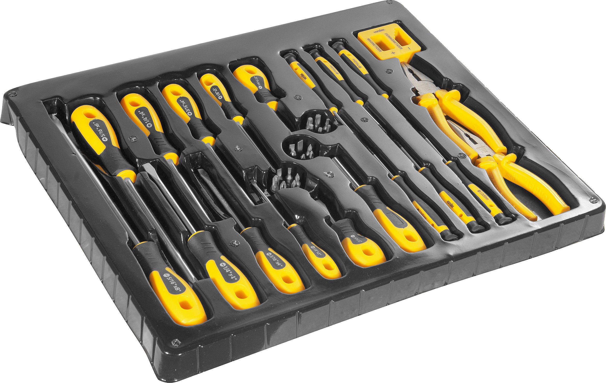 1 Jogo de ferramentas, composto por 38 peças, sendo: 5 chaves de fenda em aço cromo vanádio (1/8” x 3”, 3/16“ x 4”, 1/4" x 1.1/2", 1/4” x 4” e 5/16” x 8”, ), 5 chaves phillips em aço cromo vanádio (1/8” x 3”, 3/16” x 4”, 1/4 x 1.1/2”, 1/4 x 4” e 5/16” x 6”), 18 bits em aço cromo vanádio encaixe 1/4", sendo, 4 fenda (3 mm, 4 mm, 5 mm e 6 mm), 4 phillips (PH0, PH1, PH2 e PH3), 4 pozidrive (PZ0, PZ1, PZ2 e PZ3) e 6 hexalobular (T10, T15, T20, T25, T27 e T30), 6 chaves de precisão, sendo, 3 fenda (2 mm, 2,4 mm e 3 mm) e 3 phillips (2 mm, 2,4 mm e 3 mm), 1 desmagnetizador/magnetizador, 1 cabo adaptador de bits encaixe sextavado 1/4", 1 alicate de bico meia cana reto 6" isolação 1.000 V em aço cromo vanádio e 1 alicate universal 6” isolação 1.000 V em aço cromo vanádio.