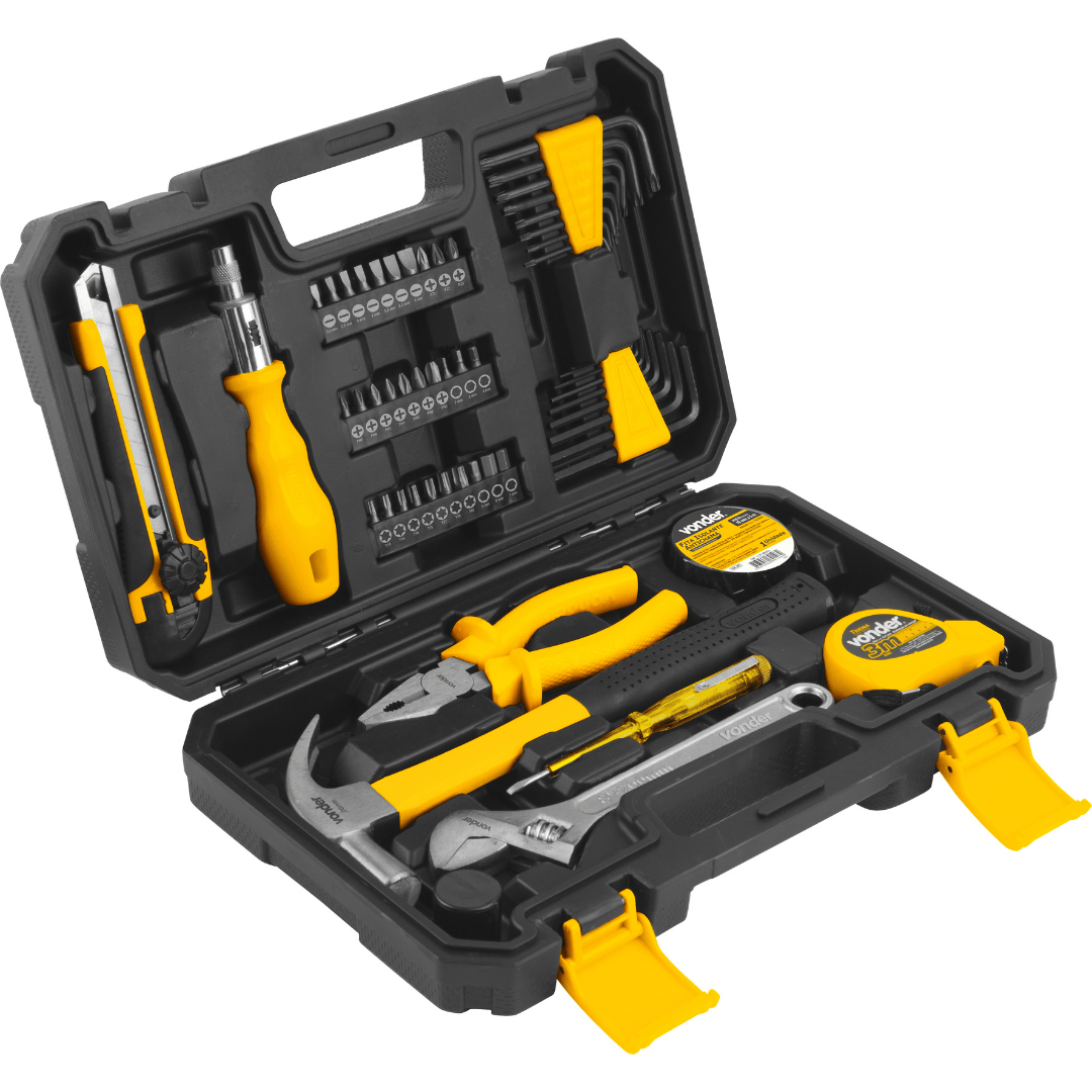 1 Jogo de ferramentas, composto por 59 peças, sendo: 8 chaves hexalobular (T9, T10, T15, T20, T25, T27, T30, T40), 8 chaves allen (1,5 mm, 2,0 mm, 2,5 mm, 3,0 mm, 4,0 mm, 5,0 mm, 5,5 mm, 6,0 mm), 3 porta bits, 30 bits de 25,0 mm, sendo: fenda (3,5 mm (2x), 4,0 mm (2x), 5,5 mm, 6,5 mm, 8,0 mm), phillips (PH0 (2x), PH1 (2x), PH2 (2x), PH3), torx (T10, T15, T20, T25, T27, T30, T40), pozidrive (PZ1, PZ2, PZ3), hexagonal (2,0 mm, 3,0 mm, 4,0 mm, 5,0 mm, 6,0 mm, 7,0 mm), 1 chave teste, 1 estilete comprimento de 6.1/2" e largura da lâmina de 18,0 mm, 1 cabo adaptador para bits com catraca encaixe 1/4", 1 alicate universal 6" com isolação até 1.000 V, 1 fita isolante 5,0 m, 1 trena de 3,0 m, 1 chave ajustável 8", 1 capa de borracha para cabeça do martelo, 1 martelo 20,0 mm com cabo em fibra de vidro. Acompanha 1 maleta plástica.